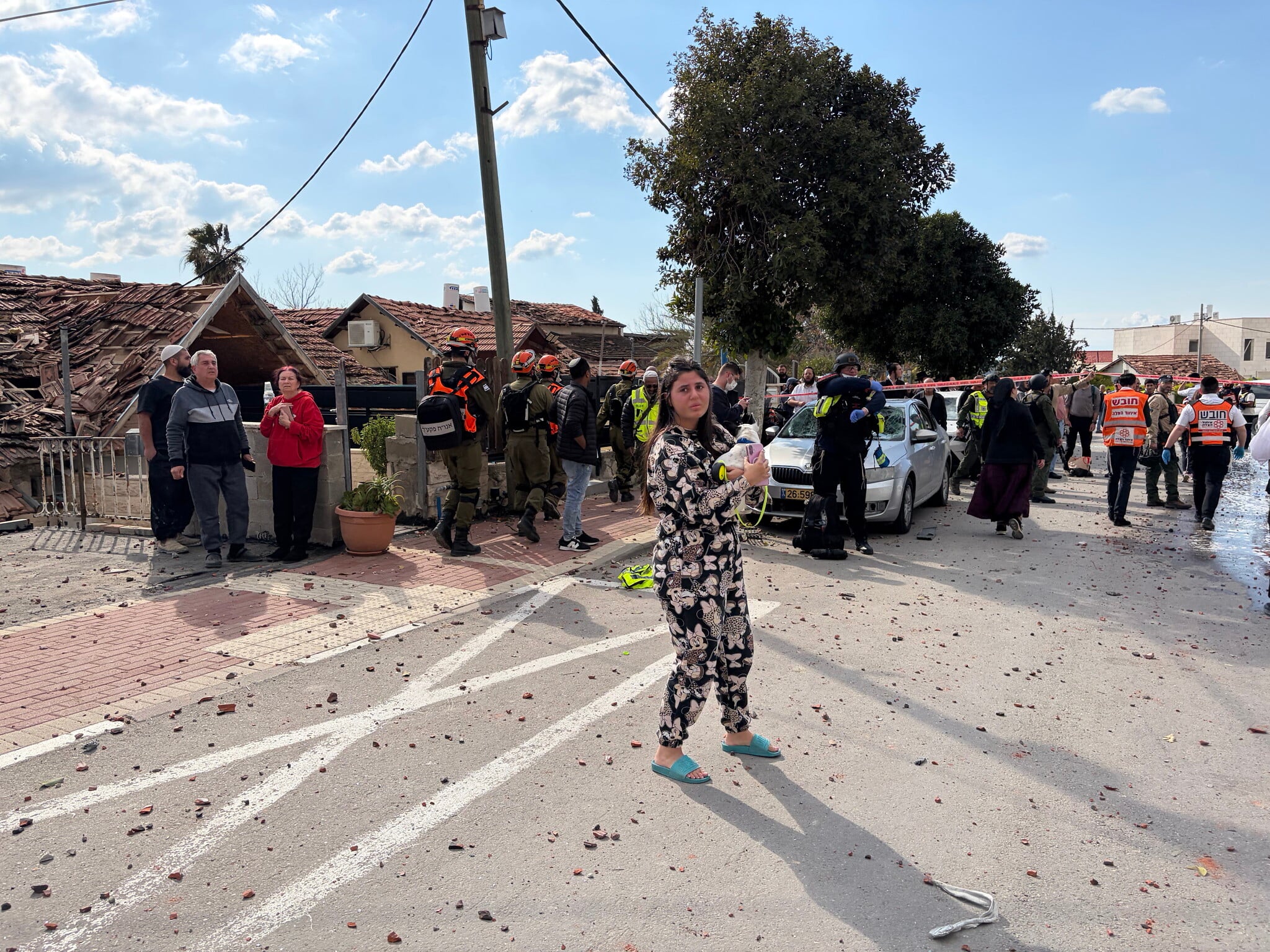 Birçoğu hâlâ pijamalarıyla şok içinde etrafta dolaşan sakinlerin arasında polis, sağlık görevlileri ve IDF İç Cephe Komutanlığı birlikleri hasar görmüş ve yıkılmış evlerin üzerine akın ederek, diğer kurtarma ekiplerini içeride neyle karşılaşacakları konusunda bilgilendirmek için kapıların yanına işaretler astılar; bu manzara, 7 Ekim 2023 saldırısının ardından Kfar Aza gibi Gazze sınır bölgelerinin durumunu hatırlatıyordu.