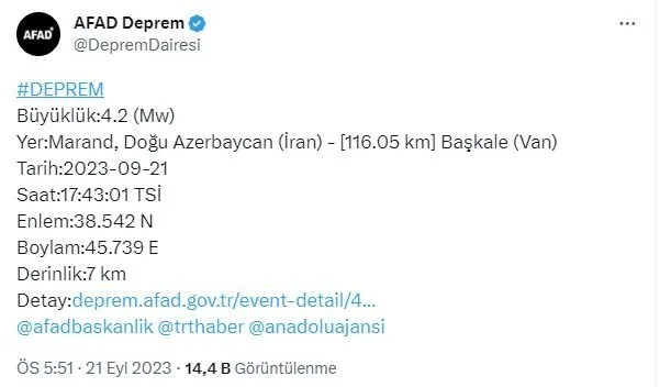 Afet ve Acil Durum Yönetimi Başkanlığı (AFAD), Türkiye sınırında saat 17.43 sıralarında deprem meydana geldiğini bildirdi. Depremin büyüklüğü 4.2 olarak ölçüldü.