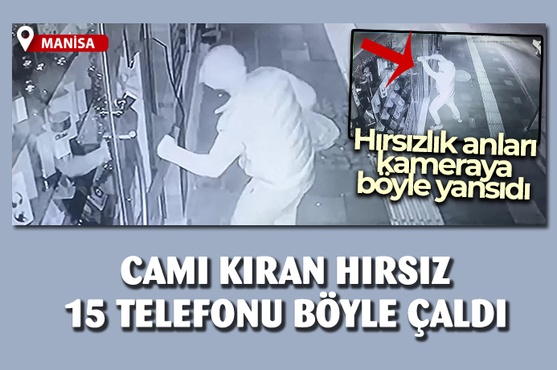 Manisa'nın Turgutlu ilçesinde bir iş yerinin camını kırarak içeri giren hırsız kısa süre içinde 15 cep telefonunu çalarak kayıplara karıştı. Yaklaşık 50 bin TL'lik hasarın olduğu hırsızlık anları ise iş yerinin güvenlik kamerasına yansıdı.