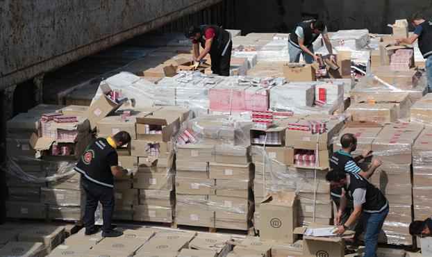Son dakika... İstanbul’da bir iş hanında, deri ve zührevi hastalıklarının yanı sıra kansere de yol açan ürünlere karşı yapılan operasyonda 9 bin 385 adet ünlü markaların taklidi kol saati, 5 bin 665 adet marka taklidi güneş gözlüğü, 6 bin 400 adet puro, değişik markalara ait 30 çift taklit spor ayakkabı, 10 adet elektronik sigara ve 610 adet sarma sigara tütünü ele geçirildi.