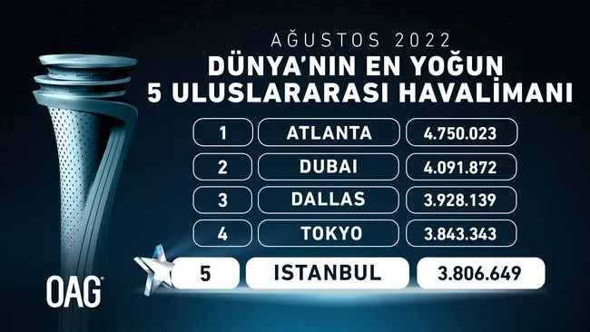 İstanbul Havalimanı işletmecisi İGA'dan yapılan açıklamada, OAG tarafından yayınlanan ve her ay güncellenen raporun toplam havayolu kapasitesi göz önünde bulundurularak hazırlandığı belirtildi.OAG'nın "Dünyadaki En Yoğun Havalimanları" raporuna göre, 2022 yılının Ağustos ayında koltuk sayısı bakımından en yoğun havalimanının Amerika Birleşik Devletleri'nde bulunan Atlanta Hartsfield-Jackson Uluslararası Havalimanı olduğu açıklandı.Atlanta Hartsfield-Jackson Uluslararası Havalimanı'nı Birleşik Arap Emirlikleri'nde bulunan Dubai Uluslararası Havalimanı ve Amerika Birleşik Devletleri'ndeki Dallas Fort Worth Uluslararası Havalimanı takip etti.