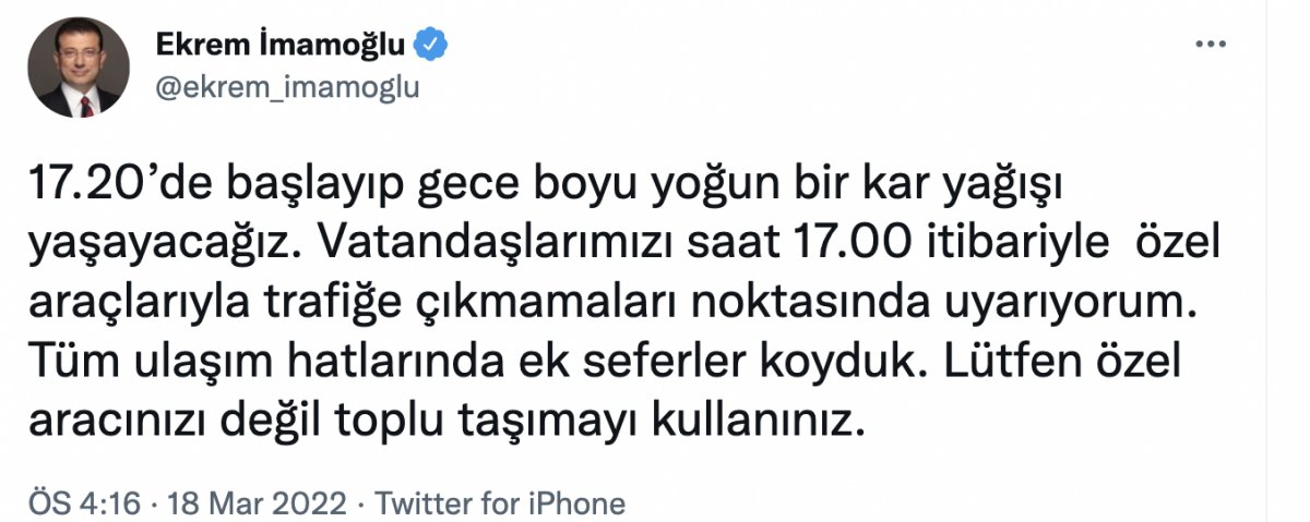 Sosyal medya hesabından bir duyuru yapan İmamoğlu, "17.20’de başlayıp gece boyu yoğun bir kar yağışı yaşayacağız. Vatandaşlarımızı saat 17.00 itibariyle özel araçlarıyla trafiğe çıkmamaları noktasında uyarıyorum. Tüm ulaşım hatlarında ek seferler koyduk. Lütfen özel aracınızı değil toplu taşımayı kullanınız." ifadelerini kullandı.