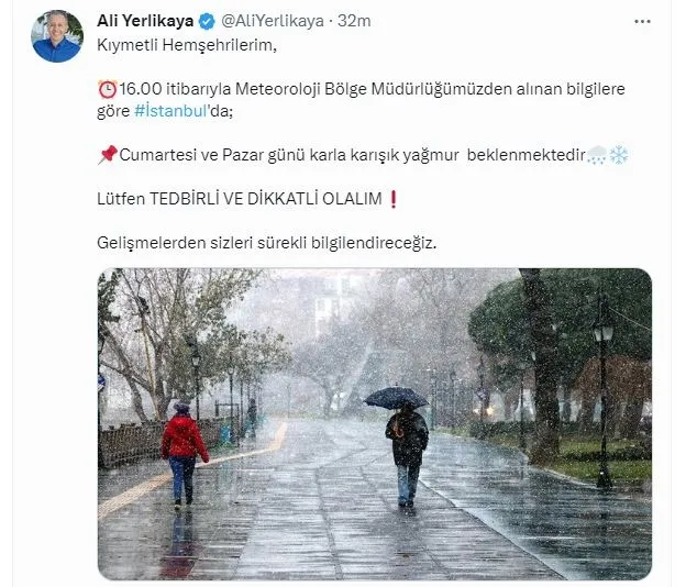 Sosyal medya hesabından açıklamalarda bulunan Yerlikaya, "Kıymetli Hemşehrilerim, 16.00 itibarıyla Meteoroloji Bölge Müdürlüğümüzden alınan bilgilere göre İstanbul'da; umartesi ve Pazar günü karla karışık yağmur beklenmektedi. Lütfen tedbirli ve dikkatli olalım. Gelişmelerden sizleri sürekli bilgilendireceğiz" ifadelerini kullandı.