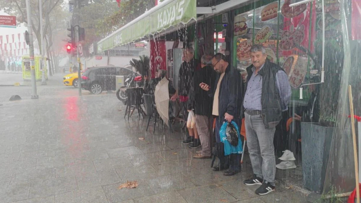 Araçlar trafikte ilerlemekte güçlük çekerken, vatandaşlar ise yağmurdan saçakların altlarına sığınarak korunmaya çalıştı.
