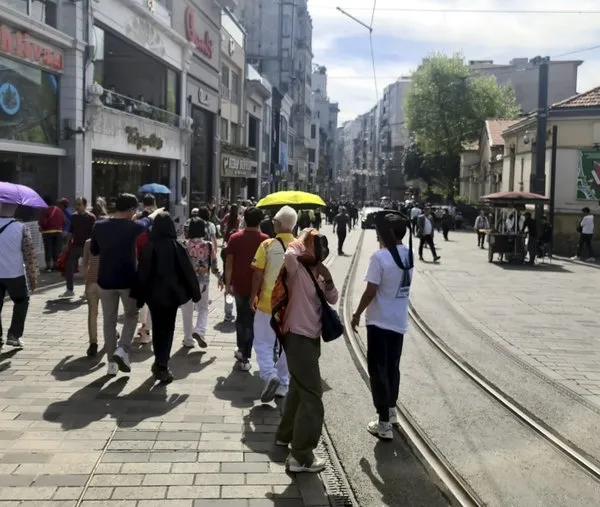 Taksim'de gezen yerli ve yabancı turistlerle esnaf sıcaktan korunmak için farklı çözüm yolları buldu. Bir esnaf kafasına taktığı ufak beyaz şemsiyeyle sıcaktan korunmaya çalıştı.