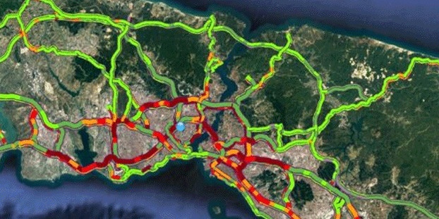 İstanbul Büyükşehir Belediyesi yoğunluk haritasında trafik yoğunluğu yüzde 80 seviyelerine ulaştı. Yağmurlu ve rüzgarlı havanın İstanbul genelinde perşembe gününe kadar etkili olacağı öğrenildi. Yetkililer ise vatandaşlara yağmurlu ve rüzgarlı havalarda dikkatli olmaları gerektiğini duyurdu.