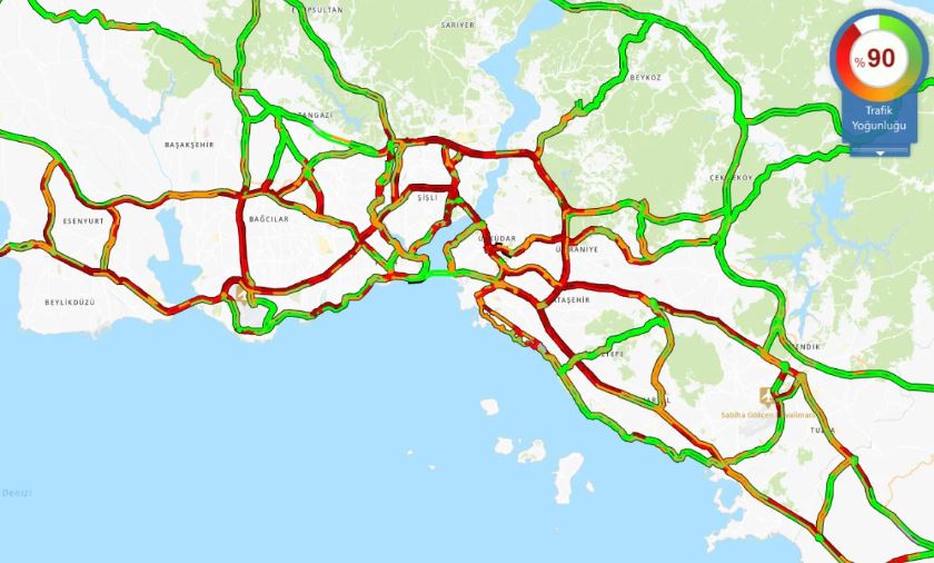 İstanbul Büyükşehir Belediyesi (İBB) Trafik Yoğunluğu Haritası'na göre kentteki trafik yoğunluğu saat 18.00'de yüzde 90'lara çıktı.