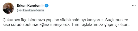 AK Parti Genel Başkan Yardımcısı Erkan Kandemir, sosyal medya hesabından yaptığı açıklamada, "Çukurova ilçe binamıza yapılan silahlı saldırıyı kınıyoruz. Suçlunun en kısa sürede bulunacağına inanıyoruz. Tüm teşkilatımıza geçmiş olsun." ifadelerini kullandı.