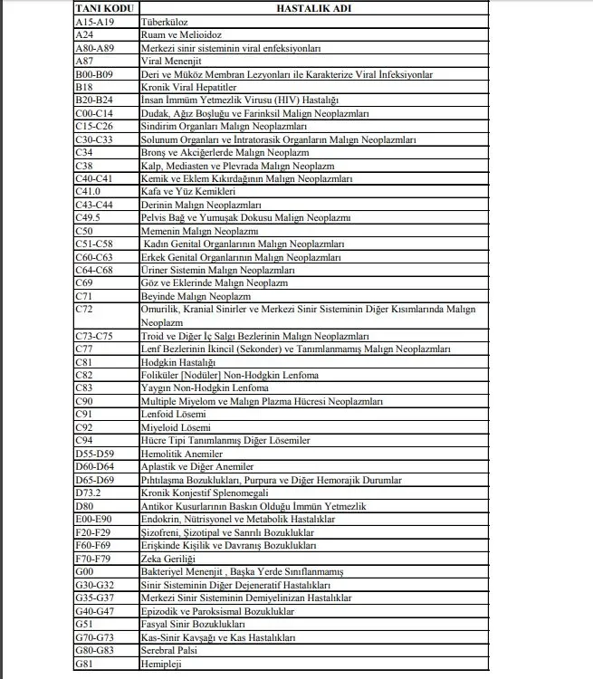 Bu listede yer alan tanılarda geçerli olmak üzere ilgili branşa sağlık raporu ile başvurularda muayene katılım payı alınmayacaktır.