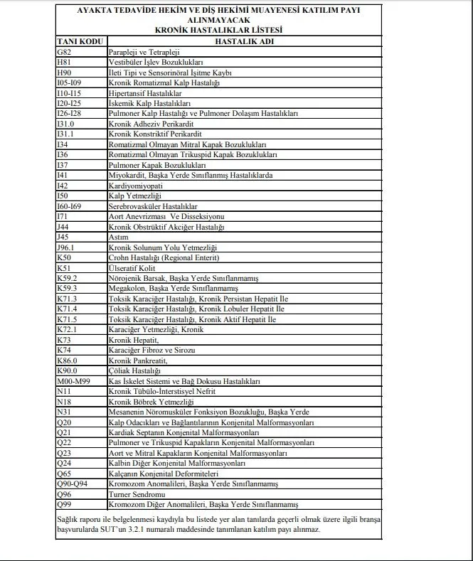 2-Güncellenmiş "Ayakta Tedavide Hekim ve Diş Hekimi Muayenesi Katılım Payı Alınmayacak Kronik Hastalıklar Listesi" ekte yer almaktadır.
