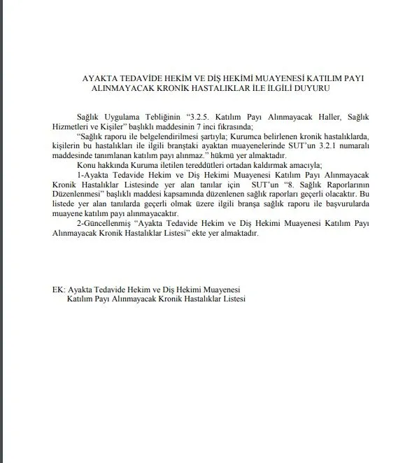Sağlık Uygulama Tebliğinin "3.2.5. Katılım Payı Alınmayacak Haller, Sağlık Hizmetleri ve Kişiler" başlıklı maddesinin 7 inci fıkrasında; "Sağlık raporu ile belgelendirilmesi şartıyla; Kurumca belirlenen kronik hastalıklarda, kişilerin bu hastalıkları ile ilgili branştaki ayaktan muayenelerinde SUT'un 3.2.1 numaralı maddesinde tanımlanan katılım payı alınmaz." hükmü yer almaktadır.