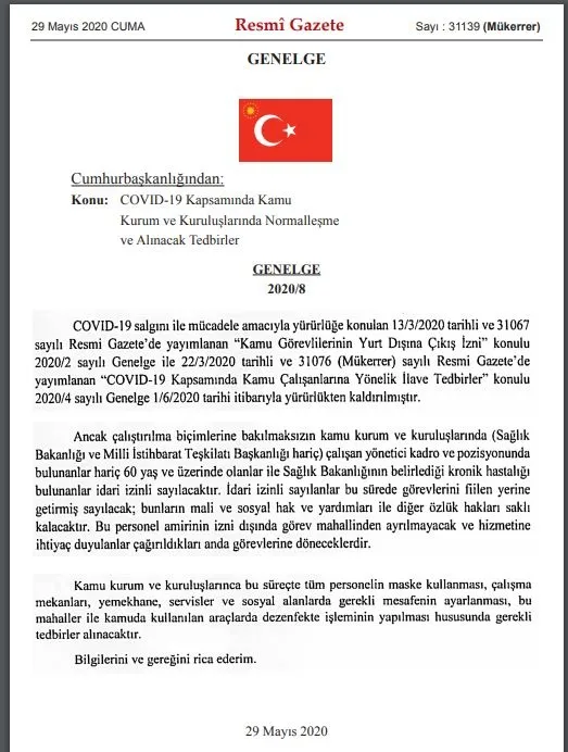 Kronik hastalığı olanlar ile hamileleri ilgilendiren idari izinlerle ilgili alınan kararları da açıklayan Cumhurbaşkanı Erdoğan, "Sağlık Bakanlığı tarafından tanımlanan ve takibi yapılan kronik hastalığı olan kamu personelinin durumları, kurumlarınca değerlendirilecek." diye açıklama yapmıştı. Buna göre, hamileler ve kronik hastaların idari izinlerinin devam edip etmemesi de çalıştıkları kurum ve kuruşlarına inisiyatifine bırakılmıştı. Şimdi bu kararla ilgili bir genelge yayımlandı.