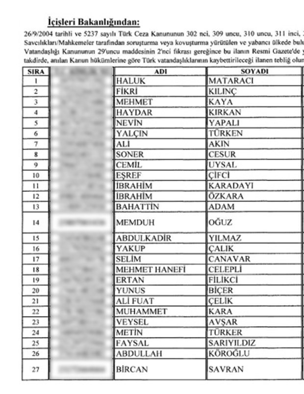 İşte vatandaşlıktan çıkarılacak 130 kişinin tam listesi