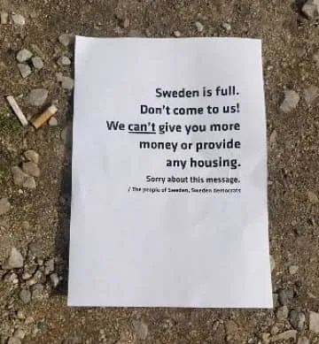Akesson ve Eriksson'un dağıttığı el ilanlarında da "Bize gelmeyin. İsveç dolu. Size daha fazla para veremeyiz. Konut sağlayamayız. Bu mesaj için üzgünüm" yazdığı öğrenildi.