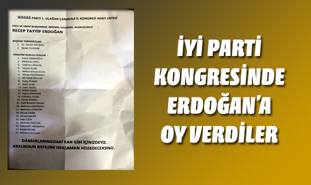 İYİ Parti Çanakkale İl Başkanlığı’nın 1. Olağan Kongresi’nde Cumhurbaşkanı Recep Tayyip Erdoğan’ın adı yazan oy kullanıldı. Oyu kullanan kişi zarfa Erdoğan’ın ismini koyarken videoya da çekti.Çanakkale Belediyesi Türkan Saylan Sosyal Tesisleri'nde yapılan kongreye Genel Başkan Yardımcısı Ümit Özdağ, Gökçeada Belediye Başkanı İYİ Partili Ünal Çetin ve çok sayıda partili katıldı.