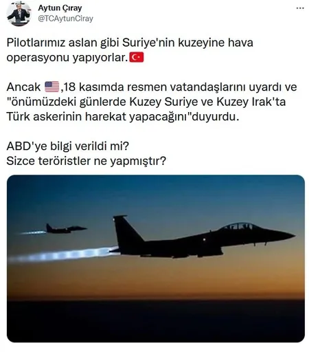 Aytun Çıray, ABD Erbil Başkonsolosluğunun açıklaması üzerinden Kahraman Mehmetçiğin harekatını lekelemeye kalkıştı. Çıray, "ABD, 18 kasımda resmen vatandaşlarını uyardı ve "önümüzdeki günlerde Kuzey Suriye ve Kuzey Irak'ta Türk askerinin harekat yapacağını"duyurdu. ABD'ye bilgi verildi mi? Sizce teröristler ne yapmıştır?" dedi.