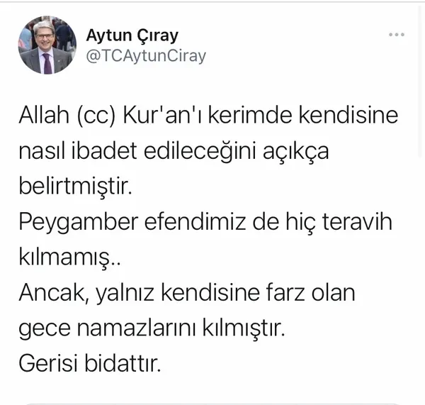 İYİ Parti İzmir Milletvekili ve İYİ Parti Genel Başkan Başdanışmanı Aytun Çıray; Peygamber Efendimiz Hz. Muhammed’in hiç teravih kılmadığını, teravih namazının bidat olduğunu savundu.
