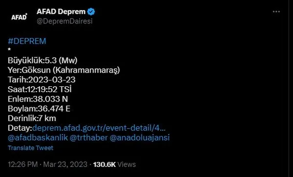 AFAD verilerine göre, deprem yerin 7 kilometre derinliğinde meydana geldi. Depremin büyüklüğü 5,3 olarak tespit edildi. AFAD'dan yapılan açıklamada, herhangi bir olumsuzluğa rastlanmadığı bildirildi.