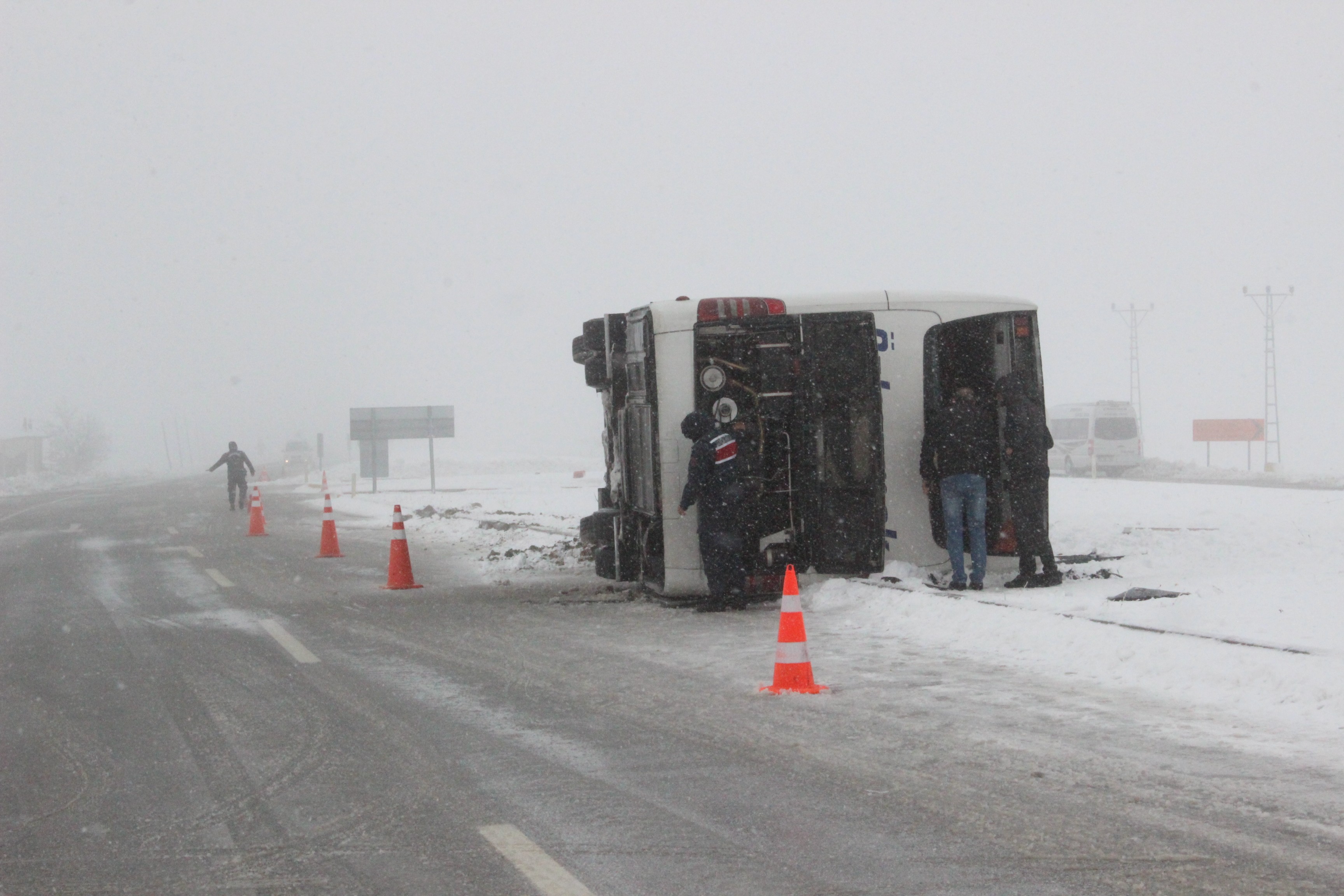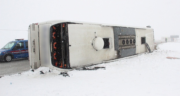 Karaman'da sis, buzlanma ve kar yağışı nedeniyle kontrolden çıkan yolcu otobüsünün devrilmesi sonucu meydana gelen trafik kazasında 25 kişi yaralandı.