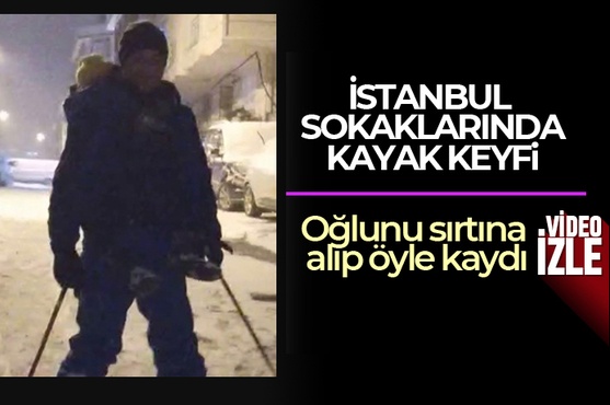 İstanbul’da karla örtülürken güvenlik amirliği yapan ve kayakla ilgilenen Nevruz Avcı da kayak takımları giydi, oğlunu sırtına alarak karla kaplı sokaklarda kayak yaparak karın tadını çıkardı.