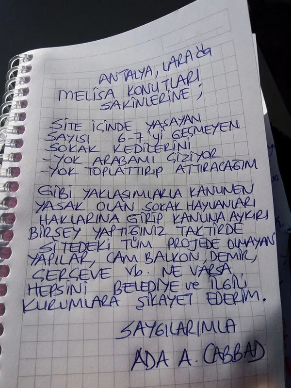 Kedilerden rahatsız olup belediyeye şikayet eden komşularını ihbar edeceğinden çekinmeyen Ada A. Cabbad yazdığı notta şu ifadelere yer verdi: "Site içinde yaşayan, sayısı 6-7'yi geçmeyen sokak kedilerini 'Yok arabamı çiziyorlar, yok toplattırıp attıracağım' gibi yaklaşımlarla kanunen yasak olan sokak hayvanları haklarına girip kanuna aykırı bir şey yaptığınız takdirde, sitedeki tüm projede olmayan yapıları, cam balkon, demir vb. ne varsa hepsini belediye ile ilgili kurumlara şikayet ederim."