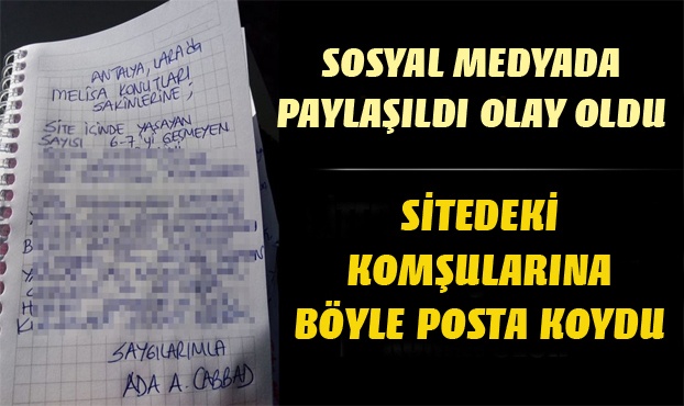 Antalya Lara'da yaşayan Ada A. Cabbad adlı vatandaş, komşularına bugüne kadar eşine az rastlanır bir not bıraktı. Cabbad, "Melisa Konutları Sakinleri, site içindeki kedilere birşey yaparsanız projede olmayan, tüm kaçakları ilgili kurumlara ihbar ederim" notunu bıraktı. Sosyal medyadan da paylaşılan not sosyal medyada büyük beğeni topladı.