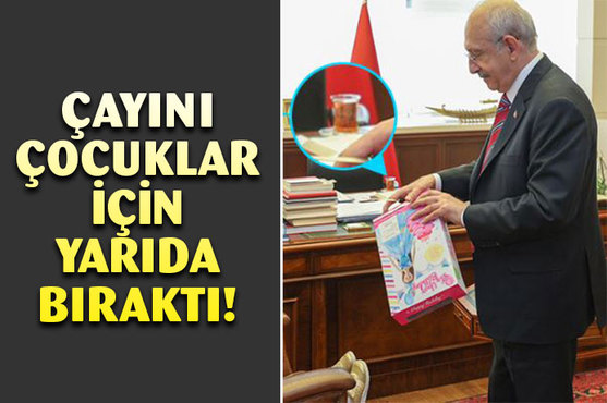 CHP Genel Başkanı Kemal Kılıçdaroğlu, kendisini makamında ziyaret eden çocuklara Atatürk'ün eseri Nutuk'u hediye etti. Kılıçdaroğlu'nun masasındaki çay dolu bardak ise dikkatlerden kaçmadı.