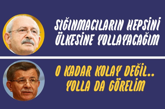 Suriye krizinin mimarlarından Gelecek Partisi Genel Başkanı Davutoğlu, siyasetin bir numaralı gündem maddesi haline gelen Suriyeli sığınmacılarla ilgili konuştu. Kılıçdaroğlu ve Babacan'ın "Gönderilmeliler" sözlerinin tersi yönünde bir yorumda bulunan Davutoğlu, "Mültecilerin geri dönüşü için uygun şartları oluşturmadan 'Mültecileri göndereceğiz' demek, söylem olarak kulağa hoş gelebilir, ama gerçekçi olmaz" ifadelerini kullandı.