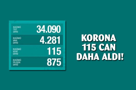 Sağlık Bakanlığı, bugün 115 hastanın daha koronaya yenik düştüğünü açıkladı. 4 bin 281 yeni vakanın tespit edildiği belirtilirken, bugün iyileşenlerin sayısı ise 875 olarak açıklandı.
