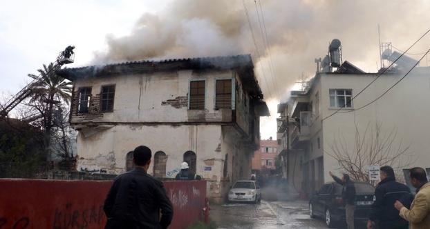Antalya'nın tarihi Balbey Mahallesi'nde çıkan yangında, tarihi ahşap bina alev alev yandı.