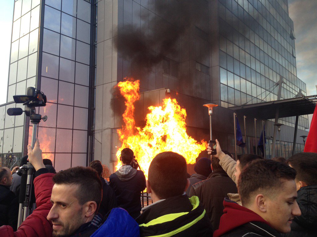 Muhalefet parti liderlerinin konuşmalarının ardından protesto gösterisi bir anda kontrolden çıktı. Bir grup gösterici önce başbakanlık binası avlusunda konuşlu Kosova polisine molotof attı. Ardından molotoflarla, başbakanlık binası hedef alındı. Atılan molotoflar nedeniyle binadan alevler yükselmeye başladı.