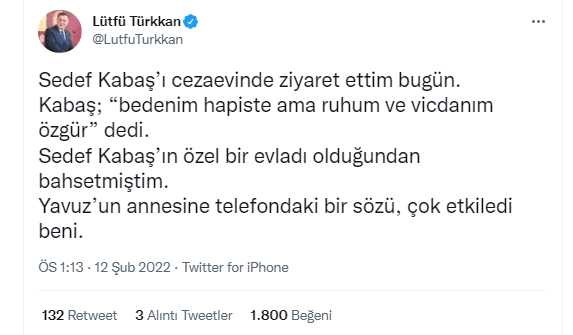 Ziyaretini Twitter hesabından duyuran küfürbaz Türkkan, "Sedef Kabaş’ı cezaevinde ziyaret ettim bugün. Kabaş; 'bedenim hapiste ama ruhum ve vicdanım özgür' dedi. Sedef Kabaş’ın özel bir evladı olduğundan bahsetmiştim. Yavuz’un annesine telefondaki bir sözü, çok etkiledi beni." ifadelerini kullandı.