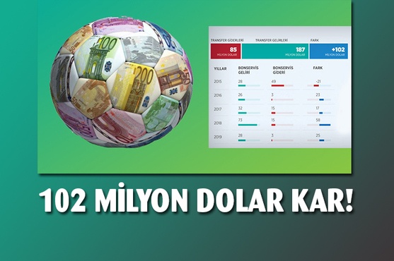 Söz konusu 5 yıllık dönemde, toplam 187 milyon dolarlık transfer geliri elde eden Türk kulüplerinin bütçesi, bu dönemde 102 milyon dolarlık bonservis geliri fazlası verdi.