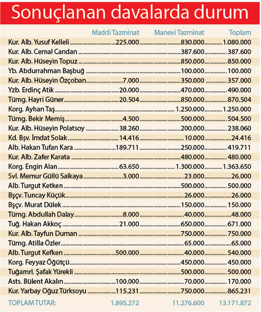 Kumpas davalarının mağduru yüzlerce emekli ve muvazzaf askerin, Adalet Bakanlığı aleyhine açtığı tazminat davalarının devlete faturası ağırlaşıyor. Şu ana kadar sonuçlanan 24 davada 27 askerin kazandığı tazminat miktarı, 11 milyon 276 bin 600 lirası manevi olmak üzere 13 milyon 171 bin 872 lirayı buldu.