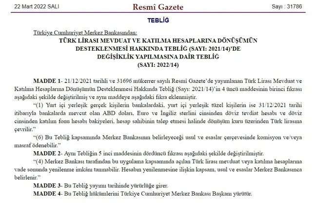 Uygulama başlarken 21 Aralık 2021 tarihinde mevcut olan dolar, euro ve sterlin hesaplarının sisteme dahil olmasına imkan sağlanmıştı. Yeni kararla bu tarih 31 Aralık 2021 olarak belirlendi.
