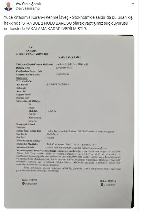 İstanbul 2 Nolu Barosu Başkanı Avukat Yasin Şamlı, yakalama kararını sosyal medyadan paylaşarak "Yüce kitabımız Kur'an-ı Kerim'e İsveç - Stokholm'de saldırıda bulunan kişi hakkında İstanbul 2 Nolu Barosu olarak yaptığımız suç duyurusu neticesinde yakalama kararı verilmiştir" şeklinde kararı duyurdu.