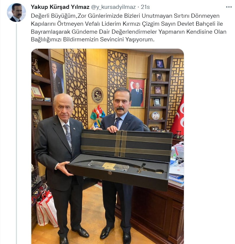 MHP lideri Devlet Bahçeli, Kürşat Yılmaz‘ı makamında kabul etti. Görüşmenin fotoğrafını Kürşat Yılmaz Twitter hesabından paylaştı. Bahçeli’ye kılıç hediye eden Yılmaz, “Değerli büyüğüm, zor günlerimizde bizleri unutmayan sırtını dönmeyen kapılarını örtmeyen vefalı liderim kırmızı çizgim sayın Devlet Bahçeli ile bayramlaşarak gündeme dair değerlendirmeler yapmanın kendisine olan bağlılığımızı bildirmemizin sevincini yaşıyorum” ifadelerini kullandı.
