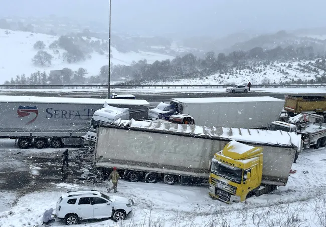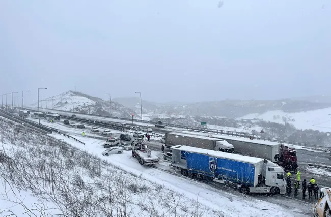 Son dakika haberi: İstanbul Arnavutköy'de, Kuzey Marmara Otoyolu'nda 4 TIR'ın karıştığı zincirleme kaza oldu. İhbar üzerine olay yerine çok sayıda ekip sevk edildi. Kaza nedeniyle Ankara istikametinde trafik yoğunluğu oluştu.Edinilen bilgilere göre İCA tarafından işletilen Kuzey Marmara Otoyolu Ankara istikameti Uskumruköy mevkiinde artan kar yağışının da etkisiyle zincirleme kaza meydana geldi.Kazaya 4 tır, 2 yolcu otobüsü ve kar küreme aracı karıştı. Olayda kar küreme aracı şoförü ve yolcu otobüsü personeli 2 kişi olmak üzere toplam 3 kişi yaralandı.