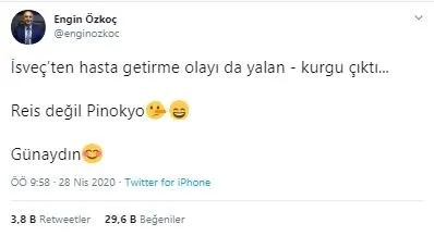 İsveç'te koronavirüse yakalanıp, hastanede tedavi edilmeden evine gönderilen Emrullah Gülüşken için Türkiye harekete geçmiş ve ambulans uçakla Gülüşken ve iki evladını alıp tedavi altına almıştı. Türkiye'nin vatandaşına sahip çıkmasını kaldıramayan CHP Milletvekili Engin Özkoç, Twitter'dan Gülüşken ailesi için linç kampanyası başlatmış ve Gülüşken ailesi için yapılan operasyonun kurmaca olduğunu iftirasını atmıştı.