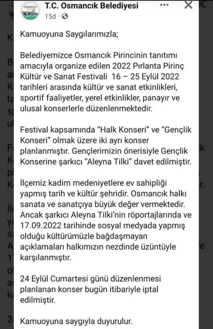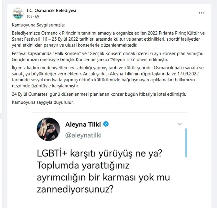 Aleyna Tilki'nin LGBT'ye destek paylaşımının ardından Osmancık Belediyesi'nin sosyal medya hesabından açıklamada şu ifadelere yer verildi; "Belediyemizce Osmancık pirincinin tanıtımı amacıyla organize edilen 2022 Pırlanta Pirinç Kültür ve Sanat Festivali, 16-25 Eylül 2022 tarihleri arasında kültür ve sanat etkinlikleri, sportif faaliyetler, yerel etkinlikler, panayır ve ulusal konserlerle düzenlenmektedir. Festival kapsamında 'halk konseri' ve 'gençlik konseri' olmak üzere iki ayrı konser planlanmıştır. Gençlerimizin önerisiyle gençlik konserine şarkıcı Aleyna Tilki davet edilmiştir. İlçemiz kadim medeniyetlere ev sahipliği yapmış tarih ve kültür şehridir. Osmancık halkı, sanata ve sanatçıya büyük değer vermektedir. Ancak şarkıcı Aleyna Tilki'nin röportajlarında ve 17.09.2022 tarihinde sosyal medyada yapmış olduğu kültürümüzle bağdaşmayan açıklamaları, halkımızın nezdinde üzüntüyle karşılanmıştır. 24 Eylül Cumartesi günü düzenlenmesi planlanan konser, bugün itibariyle iptal edilmiştir. Kamuoyuna saygıyla duyurulur"