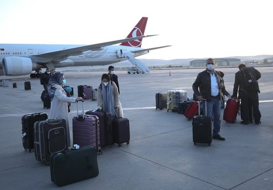 İnen uçakta bulunan 349 Türk vatandaşı, havalimanında bekleyen sağlık ekiplerince kontrolden geçirildi. Daha sonra kendilerini bekleyen otobüslere sosyal mesafe kuralı dikkate alınarak bindirilen vatandaşların koruyucu maske ve eldiven taktıkları görüldü.