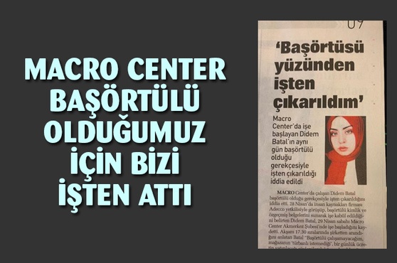 "Macro Center'den 2 başörtülü arkadaşla birlikte kovulduk"...Macro Center Akmerkez Şubesi’nin Didem Batal adlı çalışanını başörtülü olduğu gerekçesiyle işten çıkarması skandalıyla ilgili flaş bir ayrıntı daha ortaya çıktı. SABAH’a konuşan Didem Batal, aynı gün işe birlikte başladığı 2 kız arkadaşının da başörtülü olması nedeniyle işten çıkarıldığını söyledi.