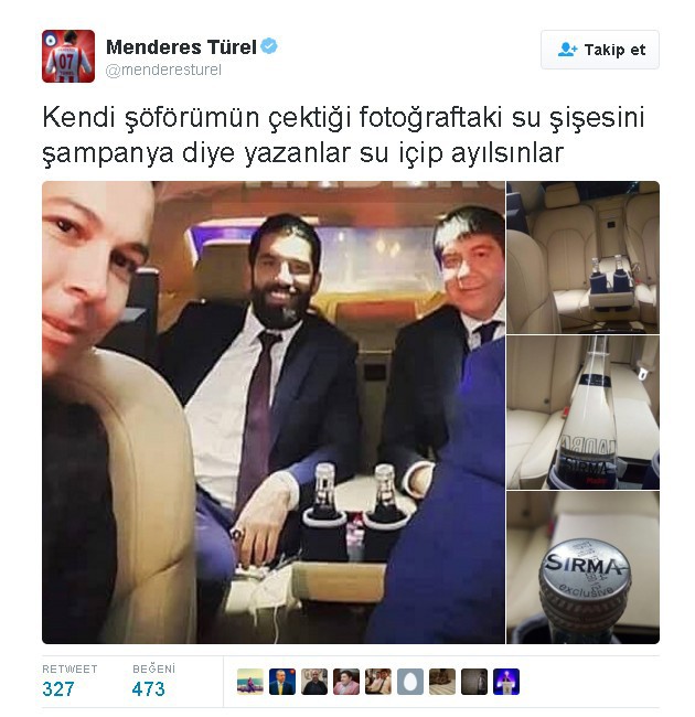 Fotoğrafın sosyal medyada paylaşılmasının ardından arka koltukta bulunan iki cam şişede şarap olduğu iddiaları ortaya atıldı. Makam aracındaki şişelerin şampanya şişesi olmadığını sosyal paylaşım sitesinden açıklayan Türel, su şişelerinin fotoğrafını da paylaşarak "Kendi şoförümün çektiği fotoğraftaki su şişesini şampanya diye yazanlar su içip ayılsınlar" notunu düştü.