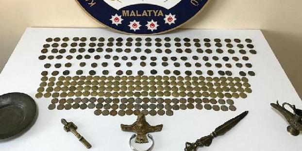 Malatya'da düzenlenen ve tarihi eser niteliğindeki sikke, tabak ve bileklikten oluşan 305 metal objenin ele geçirildiği operasyonda, 2 kişi gözaltına alındı.