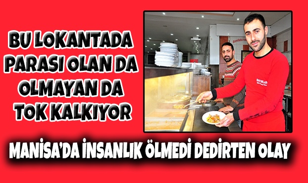 Manisa'da faaliyet gösteren bir lokanta işletmecisi parası olmayan ihtiyaç sahibi vatandaşlara ücretsiz yemek veriyor. Hayırsever işletmeci, ücretsiz yemek yiyen vatandaşların rencide olmaması için de hiçbir müşterisinden hesap sormuyor ve sadece ödeme yapan misafirlerinden para alıyor.