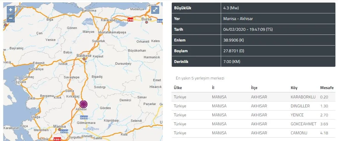 Afet ve Acil Durum Yönetimi Başkanlığının (AFAD) internet sitesinde yer alan bilgiye göre, Manisa'nın Akhisar ilçesinde saat 19.47'de 4,3 ve 20.55'de 5.0 büyüklüğünde deprem kaydedildi. Deprem, 7 kilometre derinlikte gerçekleşti.