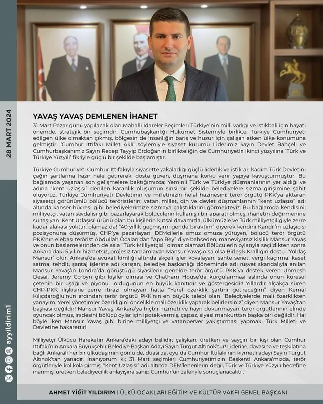 Kendisini; milliyetçi, vatan sevdalısı gibi pazarlayanların, bölücülerin kullanışlı bir aparatı olduğu ifadelerini kullanan Ülkü Ocakları Başkanı Yıldırım, "İhanetin değirmenine su taşıyan 'Kent Uzlaşısı' ürünü olan bu kişilerin kutsal davamızla, ülkümüzle ve Türk milliyetçiliğiyle zerre kadar alakası yoktur, olamaz da! '40 yıllık geçmişimi geride bıraktım' diyerek kendini Kandil'in uzlaşıcısı pozisyonuna düşürmüş, CHP'ye pazarlayan, DEM'cilerle omuz omuza yürüyen, bölücü terör örgütü PKK'nın elebaşı terörist Abdullah Öcalan'dan "Apo Bey" diye bahseden, maneviyatsız kişilik Mansur Yavaş ve onun beslemelerinden de asla "Türk Milliyetçisi" olmaz olamaz!" şeklinde konuştu.