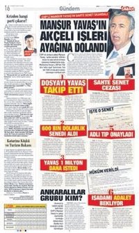 CHP'nin Ankara Büyükşehir Belediye Başkanı Adayı Mansur Yavaş'ın üç yıl önce iş takipçiliği ve sahte senet nedeniyle mahkum olmasına ilişkin haberler ses getirdi. Ankara 1. İcra Hukuk Mahkemesi'nin "sahte senetle" 600 bin doları icrada tahsil etmeye çalışınca mahkemelik olan Mansur Yavaş'a 329 bin 736 lira "kötü niyet" tazminatı, 164 bin 768 lira da para cezası verdiği ortaya çıkmıştı. Sabah'ın belgeleriyle ortaya koyduğu skandalı Türkiye Adalet Araştırmaları Merkezi (TÜRKAD) Başkanı Avukat Dr. Mehmet Sarı şöyle yorumladı: "Suç konusu meseleler hakkında da mağdurlar doğrudan savcılığa ve soruşturma makamlarına şikayet haklarını kullanabilirler. Yapılacak soruşturma ve kovuşturma sonucunda, burada 'sahtecilik' suçundan hüküm verilirse kamu görevinden men edilecek durum sözkonusu olacaktır."