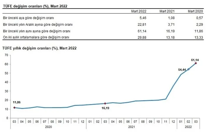 TÜFE'de (2003=100) 2022 yılı Mart ayında bir önceki aya göre %5,46, bir önceki yılın Aralık ayına göre %22,81, bir önceki yılın aynı ayına göre %61,14 ve on iki aylık ortalamalara göre %29,88 artış gerçekleşti.