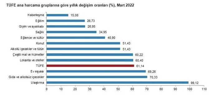 Ana harcama grupları itibarıyla 2022 yılı Mart ayında en az artış gösteren ana gruplar %1,78 ile giyim ve ayakkabı, %1,84 ile konut ve %2,78 ile eğlence ve kültür oldu. Buna karşılık, 2022 yılı Mart ayında artışın yüksek olduğu ana gruplar ise sırasıyla, %13,29 ile ulaştırma, %6,55 ile eğitim, %6,04 ile lokanta ve oteller oldu.